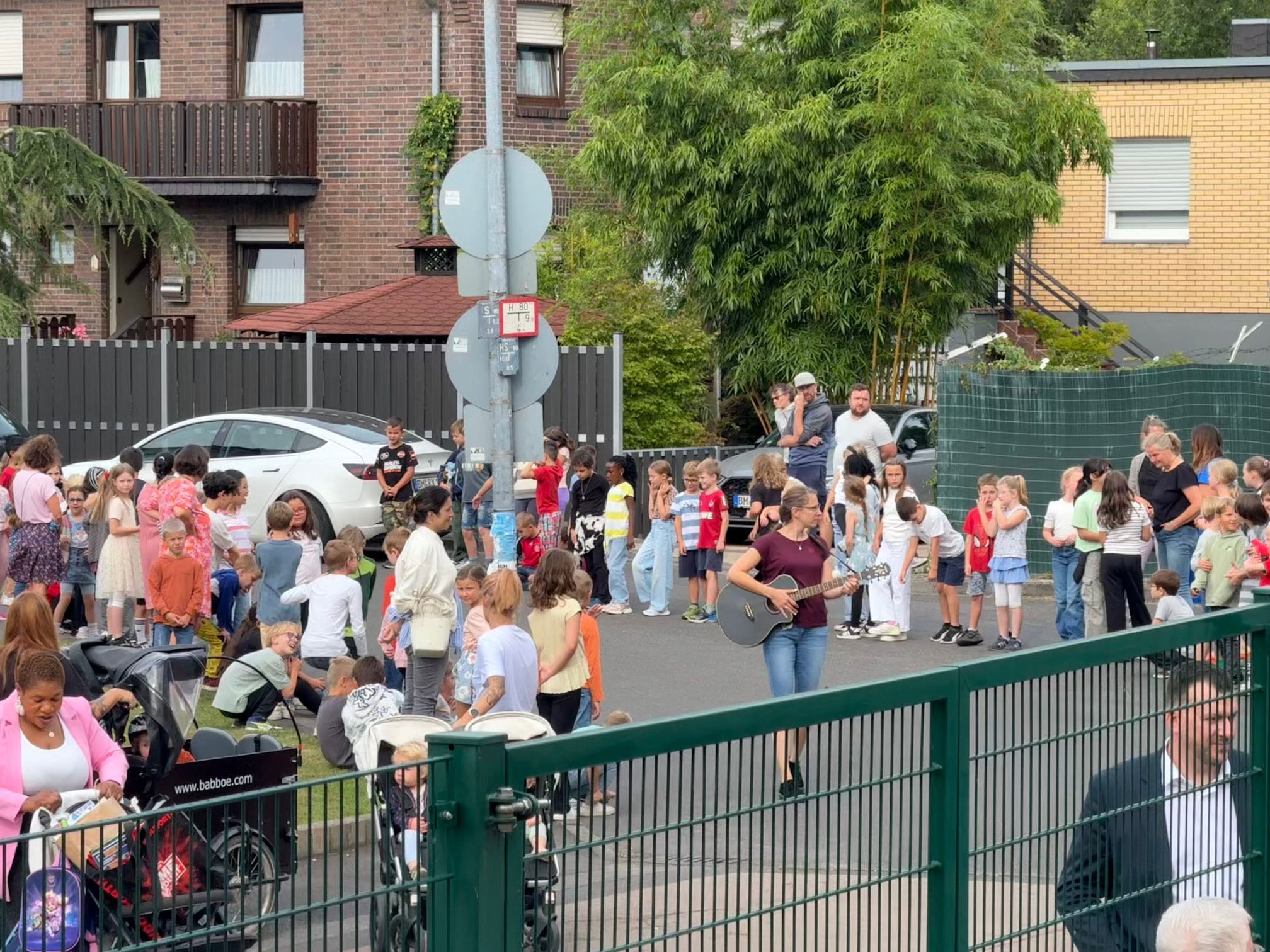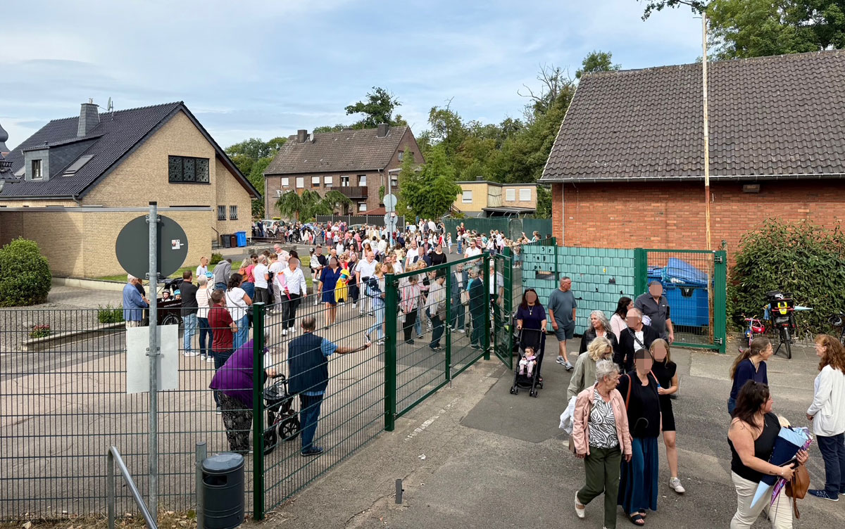 Traditionell begann der Einschulungstag mit einem ökumenischen Gottesdienst in der St. Kunibertus-Kirche. Auf dem Weg von der Kirche zur Schule bildeten über 200 Schul- und Kitakinder ein Spalier und begrüßten die neuen Erstklässler singend.