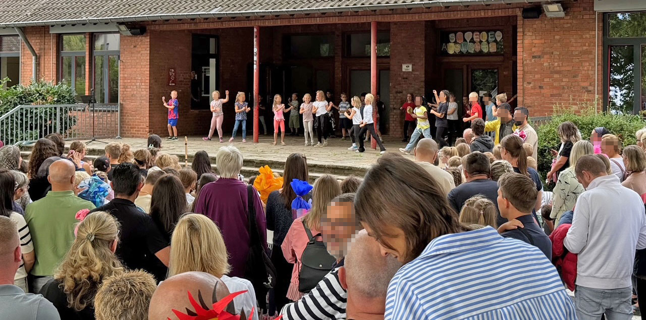 Auf der Außenbühne hieß Herr Müller die Kinder der neuen „Elefanten-“ und „Eichhörnchenklasse“ sowie ihre Familien herzlich in der Schulgemeinschaft willkommen. Ein buntes Rahmenprogramm sorgte für fröhliche Stimmung: Die Klasse 2b begeisterte mit einer Tanzvorführung, während die Klasse 2a ein Lied zum Besten gab.