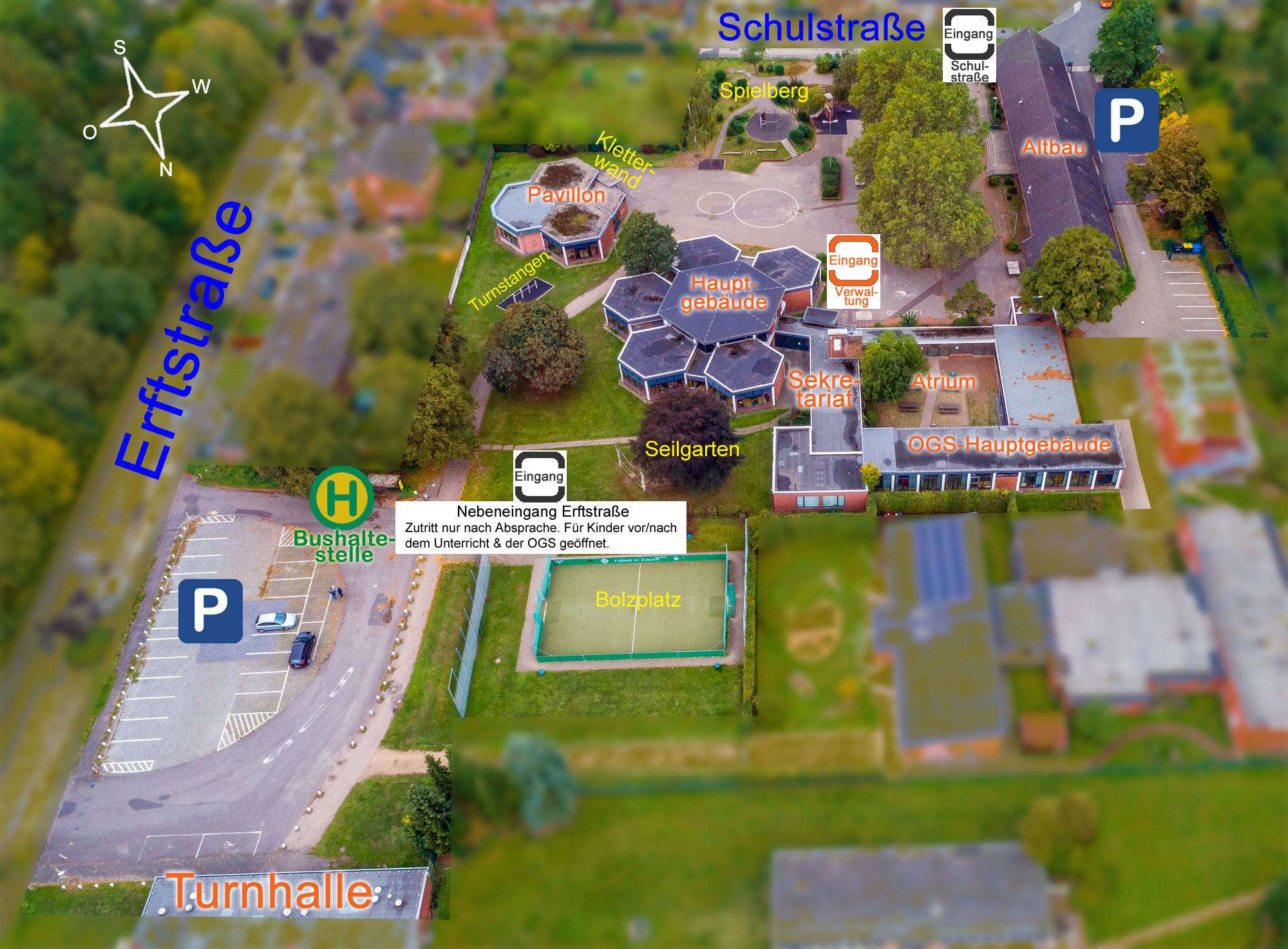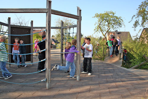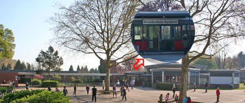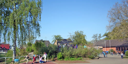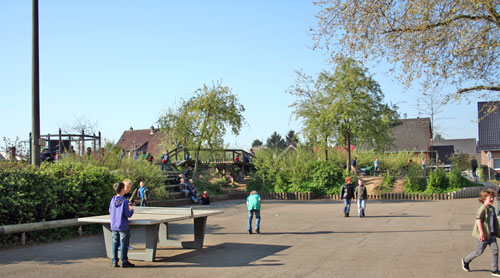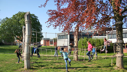 Auf unserem großzügigen Schulgelände haben die Kinder in den Pausen und in der OGS einen weiten Bewegungsraum mit Spielberg, Wiesen, Mini-Spielfeld (=Kunstrasen-Fußballplatz), vielen Spielgeräten (z.B. Tischtennisplatten, Hangrutsche, Kletter- und Spielgeräte, Kletterwand, Seilgarten ...) und dem "Atrium" (als Freiluft-Klassenraum, für Klassenfeste etc.).
