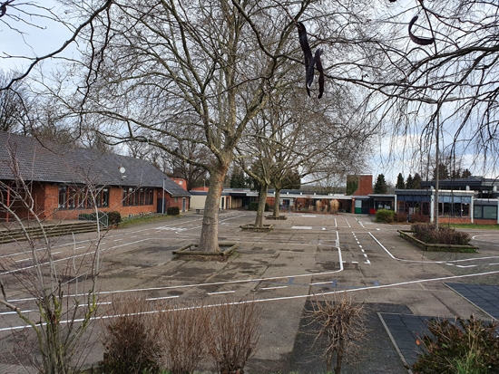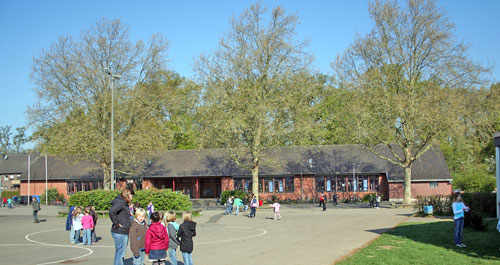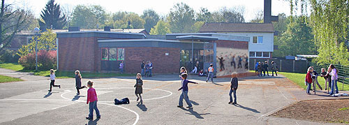 Blick über den Schulhof auf den Haupteingang. In dem Hauptgebäude befinden sich das Hausmeister-Büro, die Verwaltung, die Aula, der Musikraum, die Schülerbücherei, OGS-Räume und drei Klassenräume.